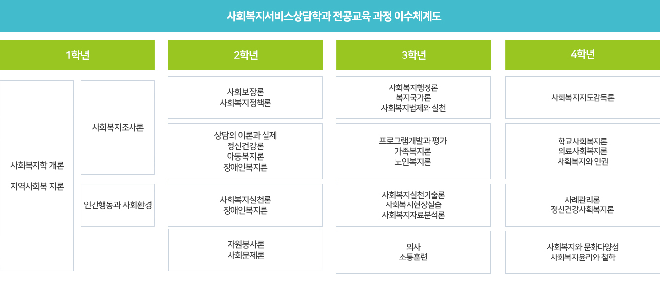 | 전공실무 | 사회보장론, 사회문제론, 지역사회복지론, 아동복지론, 노인복지론, 장애인복지론, 가족복지론, 여성복지론, 청소년복지론, 사회복지실천론, 사회복지실천기술론 |